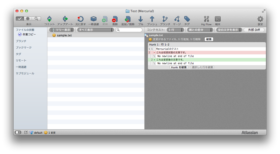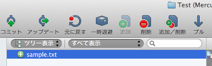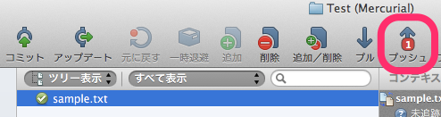 なお、「プッシュ」アイコンに①と表示されるが、他のレポジトリと接続して、変更を送ることができる。今はとりあえずローカルレポジトリのみなので、また今度。