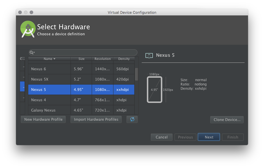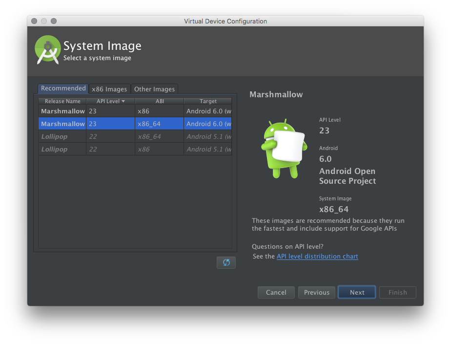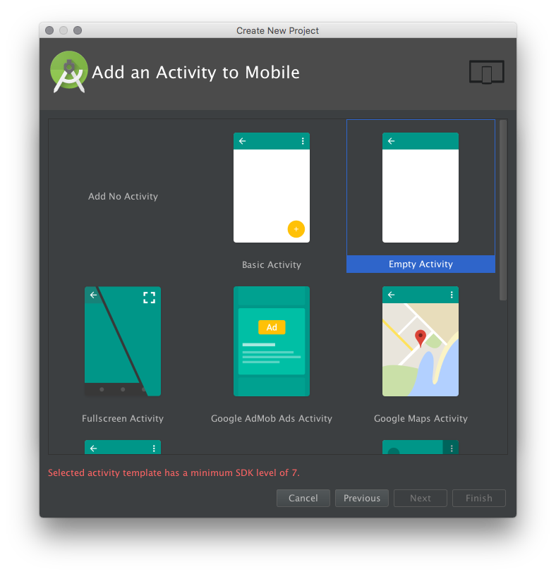 対象とするデバイスの種類と最低限必要なAndroid(API)のバージョンを選択する。