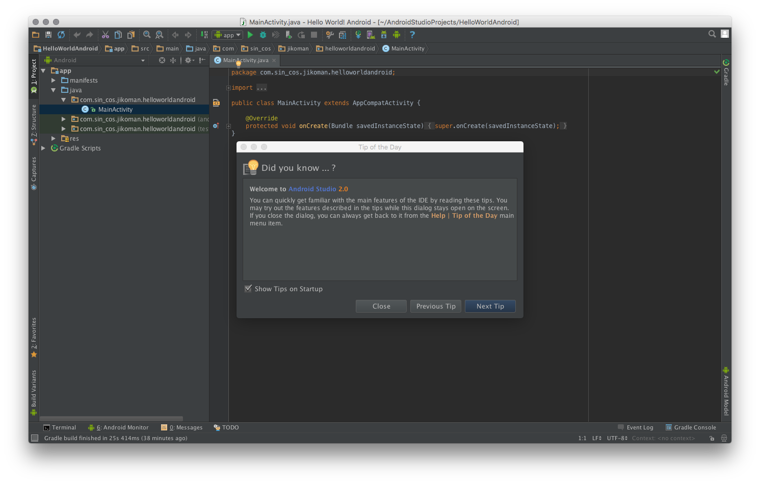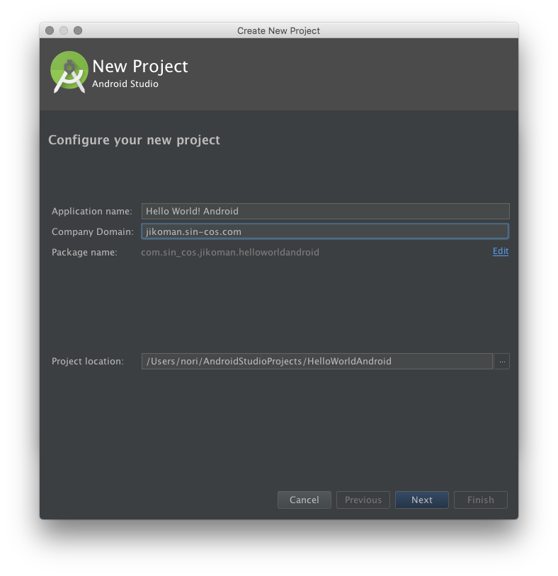 “Application name”には、「Hello world! Android」など、アプリの名前。
