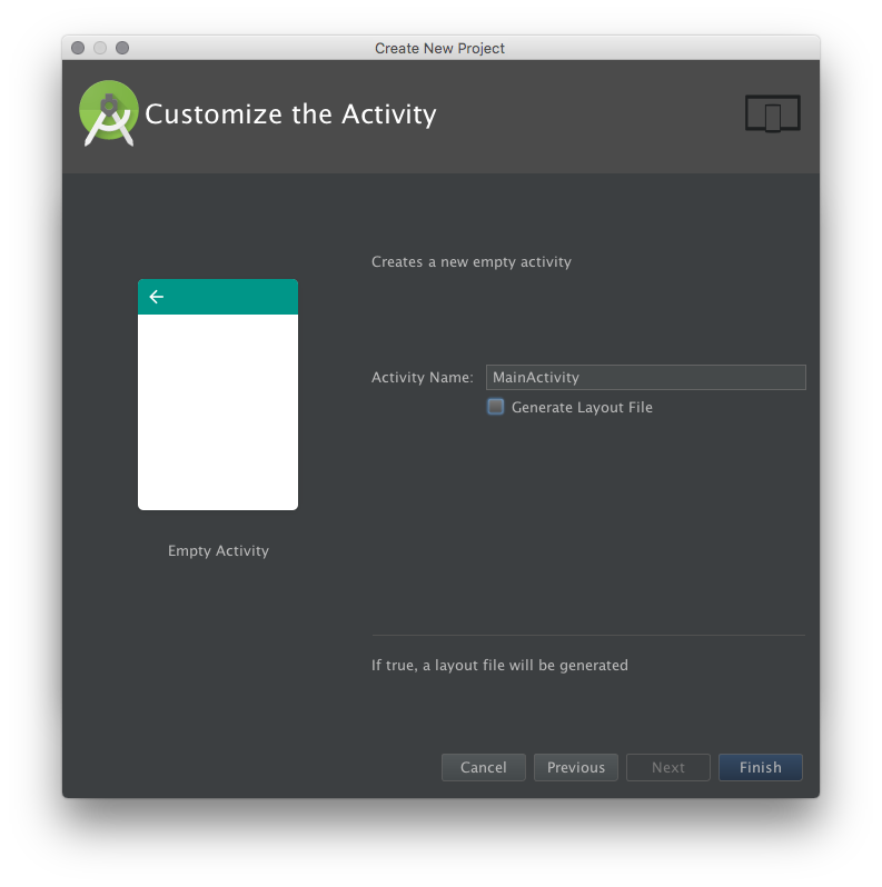 Hello world!に、レイアウトなんか要らない?と思いきや、Hello world自体もレイアウト中のテキストボックスなので「Generate Layout File」のチェックは付けたまま「Finish」