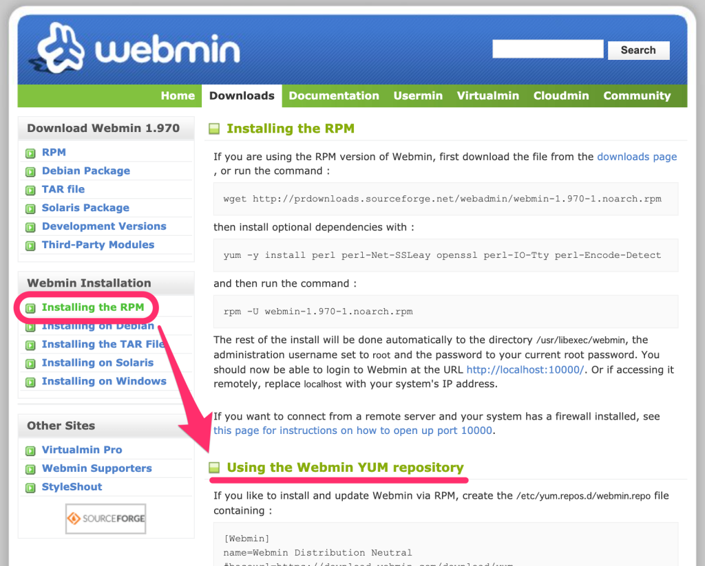 「Installing the RPM」を選択し、「Using the Webmin YUM repository」の手順を参考にインストールしていこう。