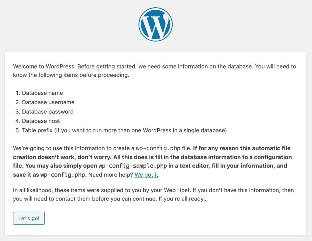 [Let’s go!]をクリックすると、データベースの接続情報を入力する画面が表示されます。