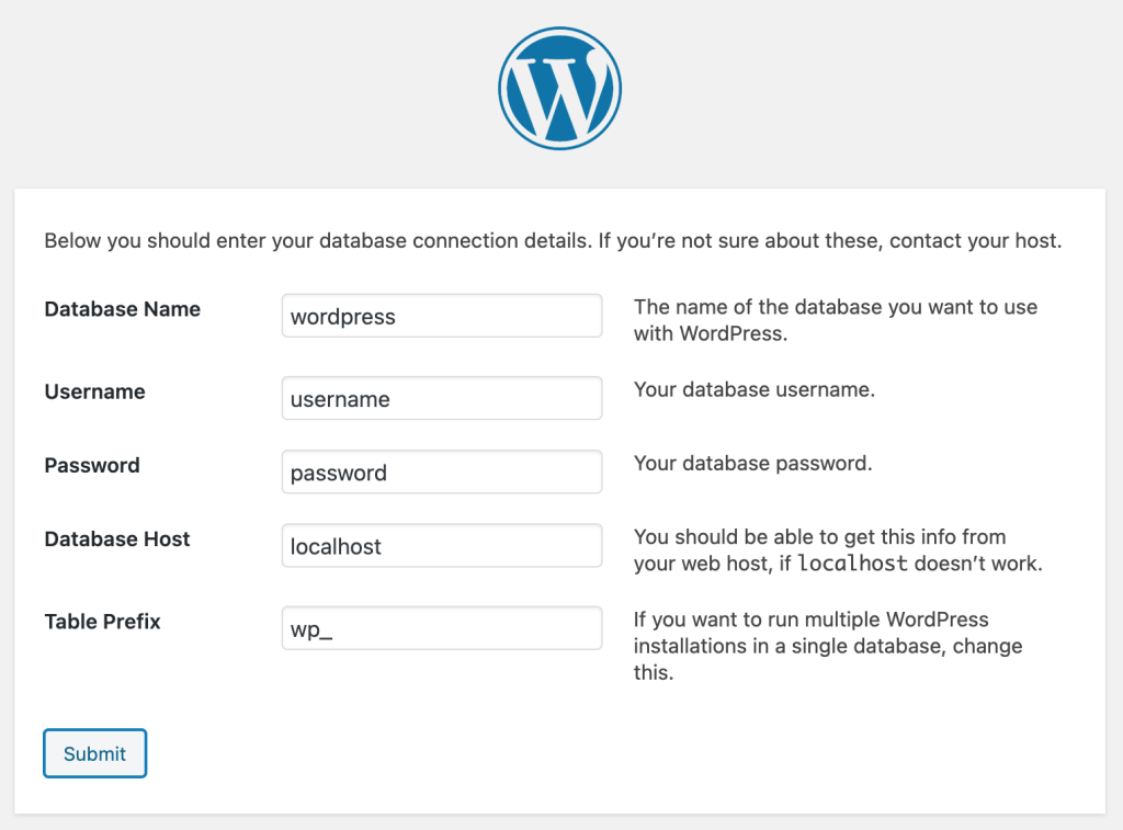 あなたが作成したデータベース名と、ユーザー・パスワードを入力して、[Submit]をクリックしましょう。
