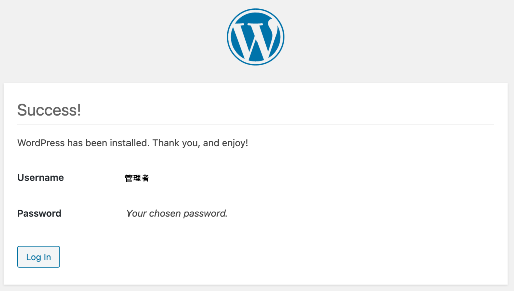 [Install WordPress]をクリックすると、次の画面が表示されてインストールが完了です。