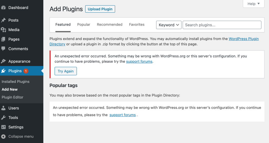 さて、今回は、プラグインやテーマを追加するときにエラーが出たときの対処方法を。