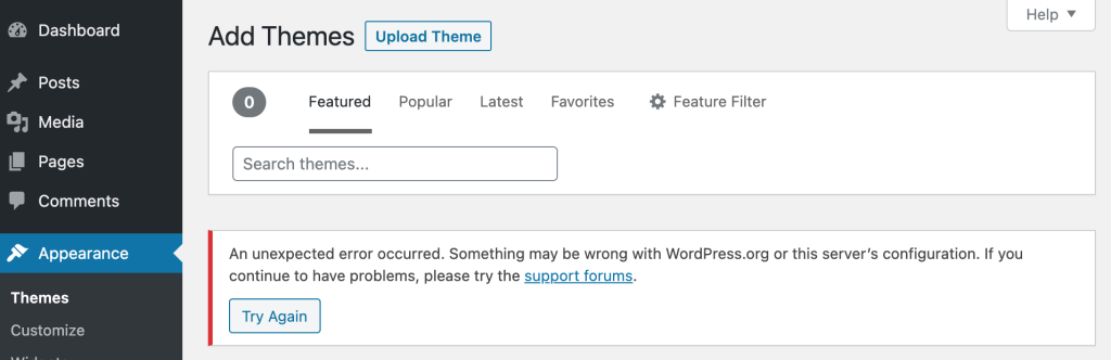ちなみに、原因が同じなら、Appearance→ThemesのAdd Themesでも、同様に以下のエラーとなります。