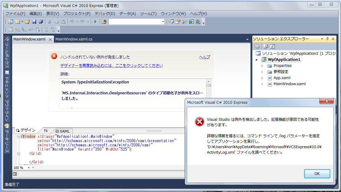 詳細な情報を得るには、コマンド ラインで /log パラメーターを指定してアプリケーションを実行し、’D:UsersuserAppDataRoamingMicrosoftVCSExpress10.0ActivityLog.xml’ ファイルを調べてください。