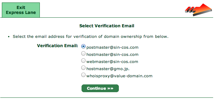 すると、whois情報を手がかりに、認証で利用するためのメールアドレスが一覧で表示されるので、どれかを選択。